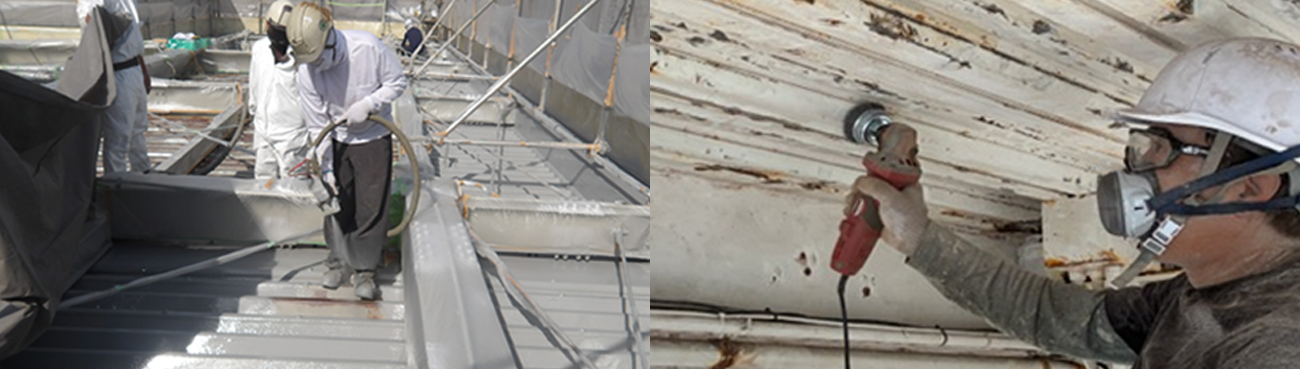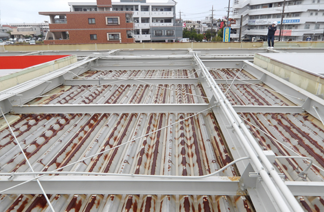 弊社では現場調査を行い、その状況に応じた最適な施工法や材料をご提案し、お客様のご要望にお応えしております。 折半屋根の腐食修繕やコンクリートの劣化補修・鉄筋の腐食修復、駐車場や壁・床の防水工事をはじめ、屋外設備(ファンカバー・貯水タンク等)の防錆工事や屋内設備(ボイラー室等)の防錆工事、さらに屋根防水工事や防火戸の取替工事など、多岐にわたるメンテナンス工事に対応しております。